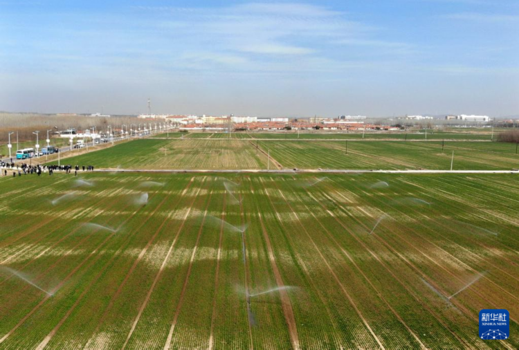 在青岛西海岸新区大场镇一处农田里,地埋式自动伸缩喷灌设备浇灌小麦(3月13日摄,无人机照片)。