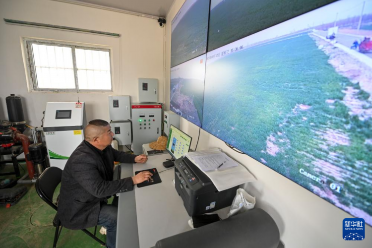 在运城市盐湖区解州镇曲村,农户董会龙通过智慧农业物联网系统查看农作物生长情况(3月12日摄)。