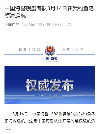 3月14日,中国海警1302舰艇编队在我钓鱼岛领海内巡航。这是中国海警依法开展的维权巡航活动。