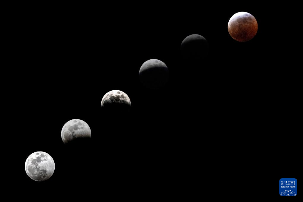 这张拼版照片显示的是3月13日至14日在墨西哥首都墨西哥城拍摄的月食过程。