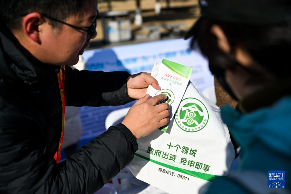 3月15日,在内蒙古博物院宝鼎广场,工作人员(左)给市民介绍食品安全责任保险知识。