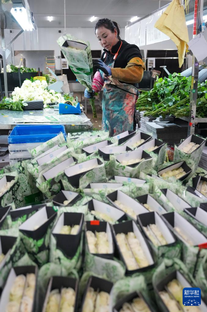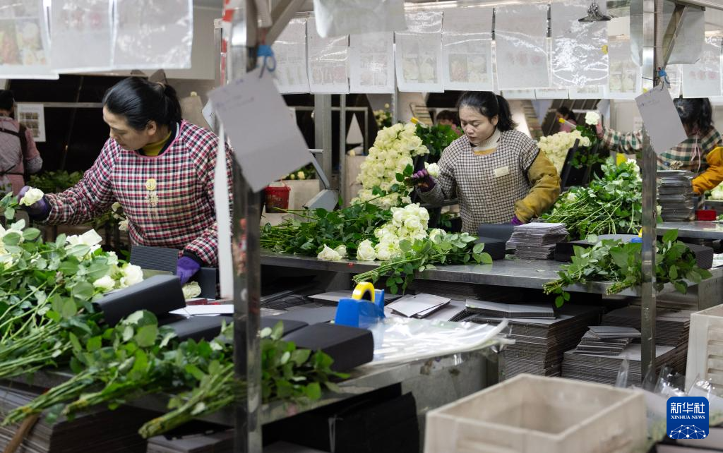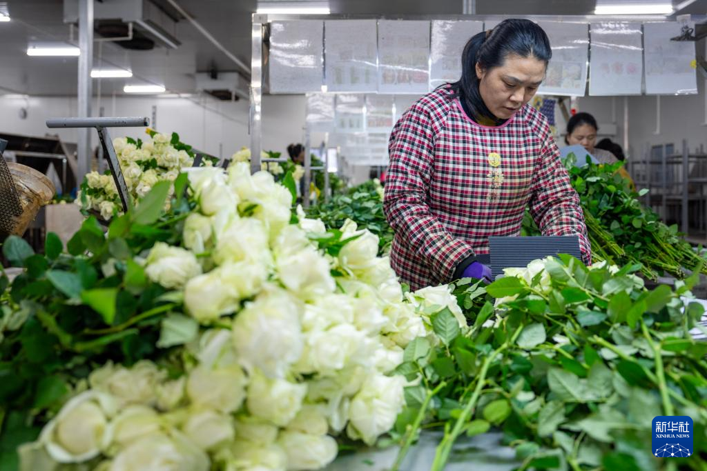 3月16日,花农在姚安毅云花卉有限公司分拣包装车间内包装鲜花。
