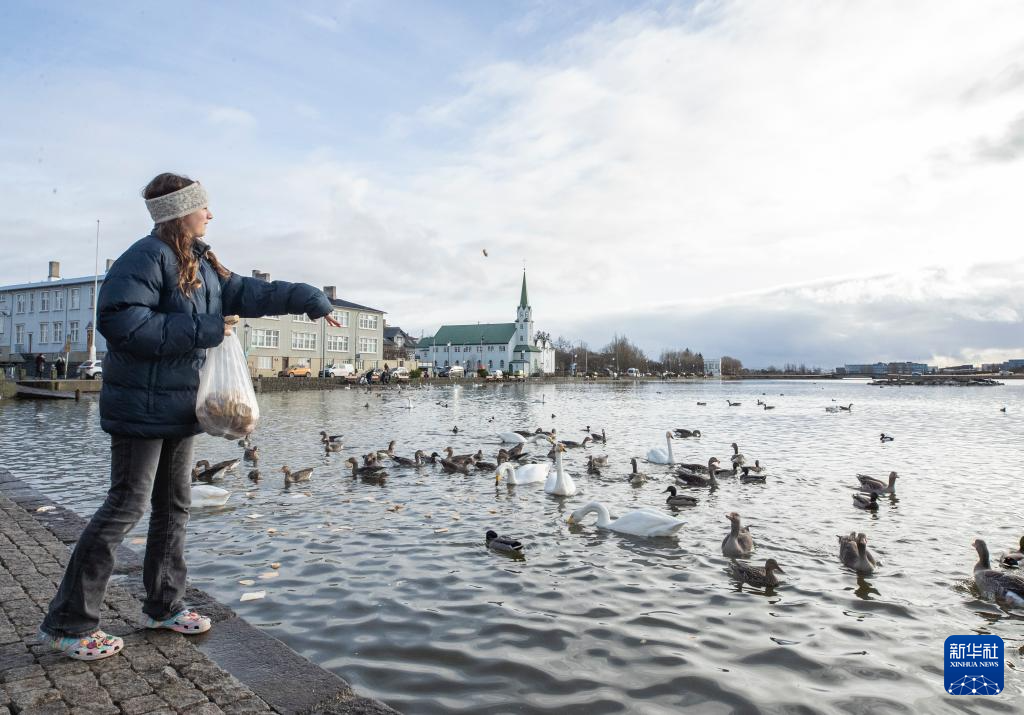 3月15日,在冰岛首都雷克雅未克,一名女孩在特约宁湖投喂天鹅。