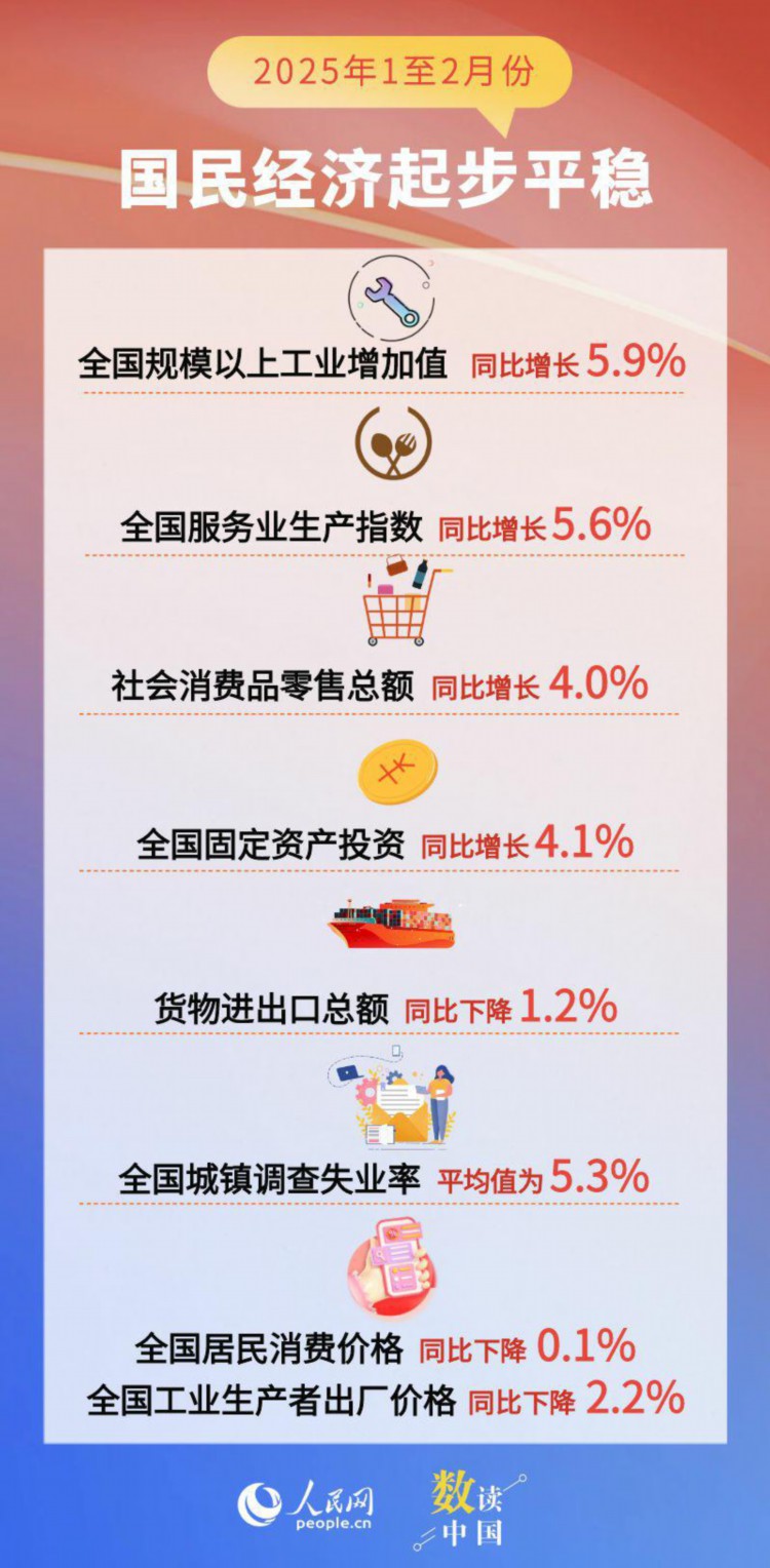 人民网北京3月17日电 (记者杨曦)国家统计局今日发布数据显示,1至2月份,一揽子存量政策和增量政策继续发力显效,工业服务业较快增长,消费投资继续改善,就业形势总体稳定,新质生产力成长壮大,经济运行起步平稳,发展态势向新向好。
