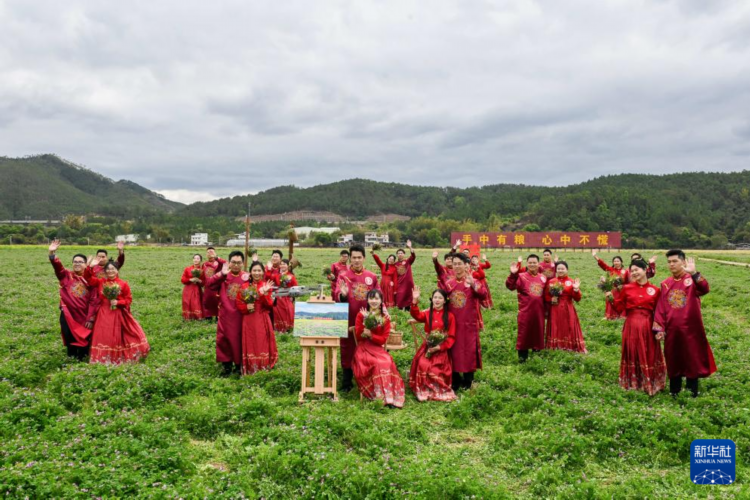 当日,“紫云花海 映影幸福”乡村绿美文化婚庆活动在广东河源市东源县柳城镇万绿智慧农场内举行。15对新人参加集体婚礼,在紫云英花海的见证下,通过植树、花田婚拍等活动践行婚俗新风尚,倡导简约环保的婚庆理念。