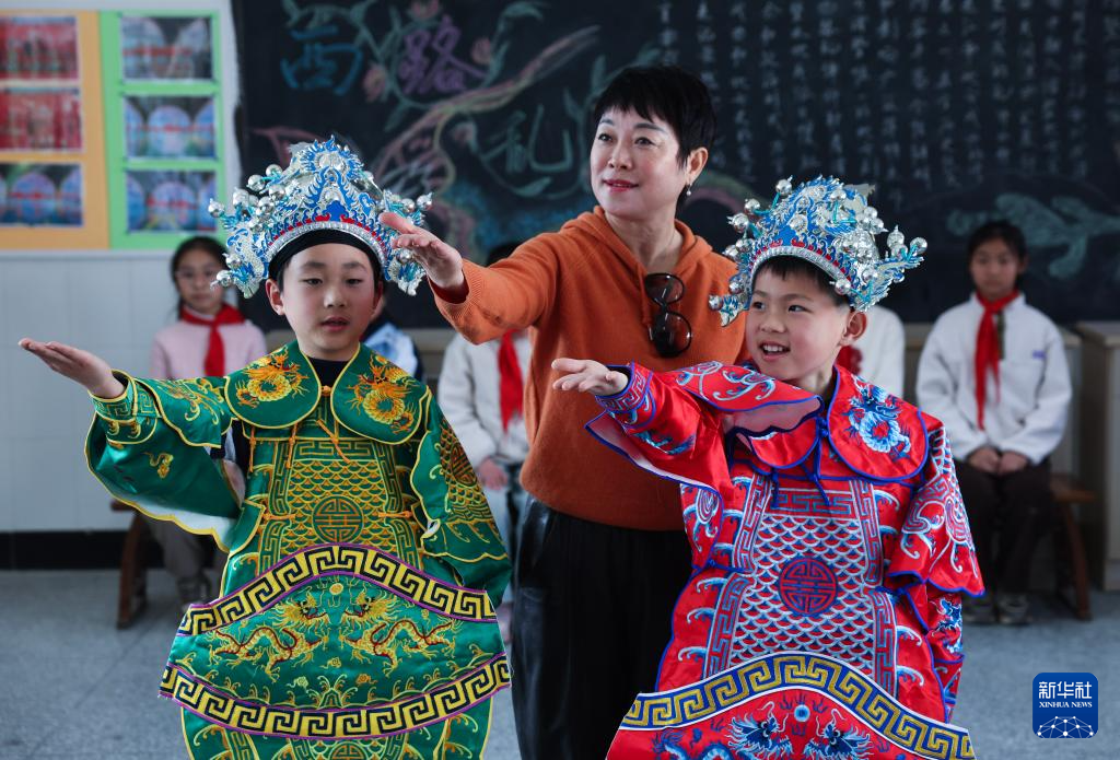 3月18日,东和乡小学西路乱弹传承特色班的学生在东和乡十里坪村文化特派员卓秋萍(中)的指导下学习西路乱弹的表演动作。