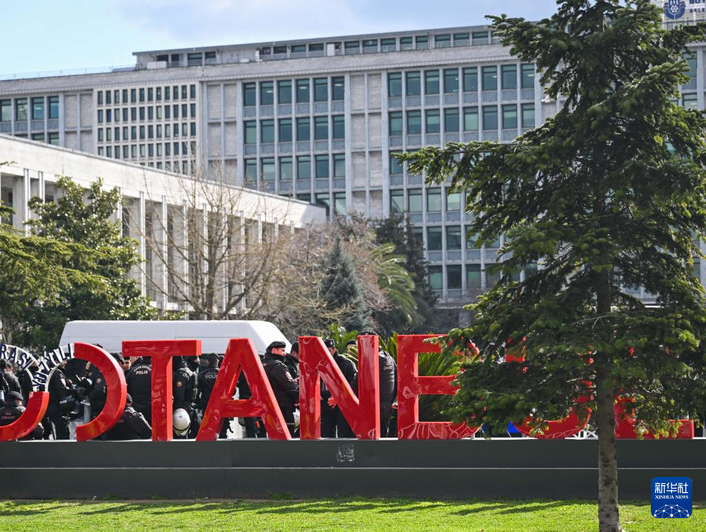 3月19日,警察在土耳其伊斯坦布尔市政府外维持秩序。