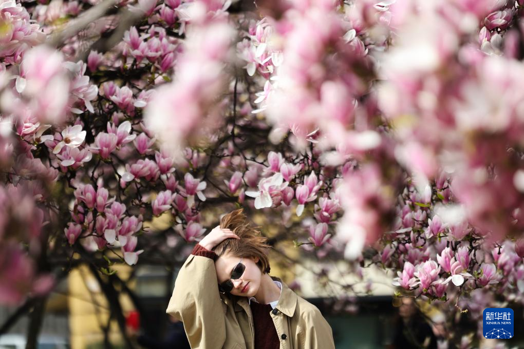 3月18日,在意大利米兰,一名女子在街心公园的玉兰花下留影。 早春时节,意大利米兰街头春花绽放,游人如织。 新华社记者 李京 摄