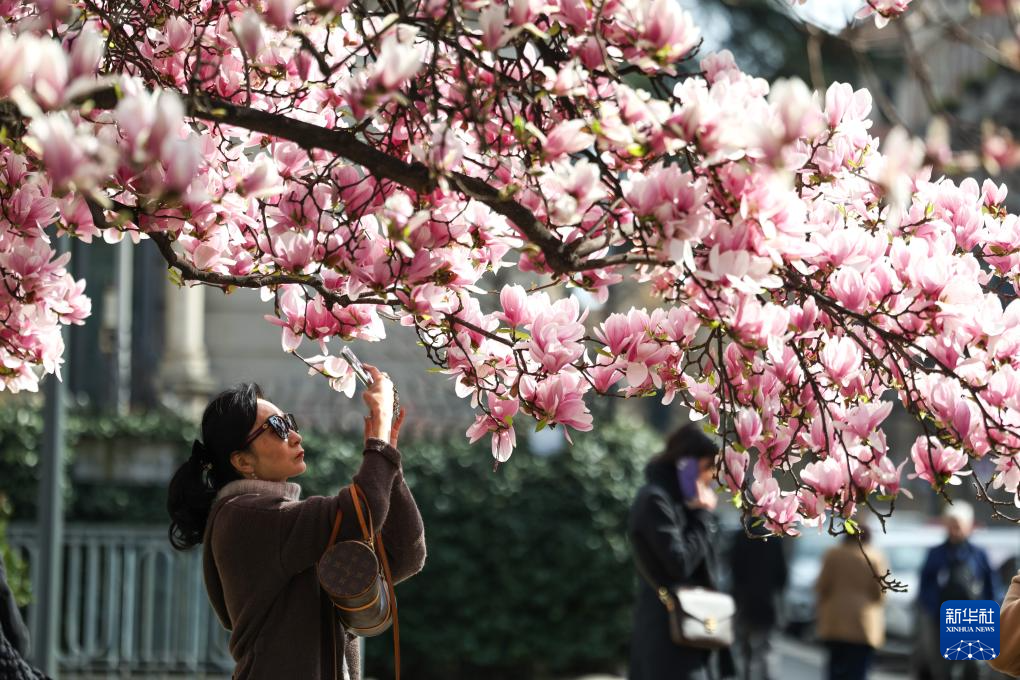 3月18日,在意大利米兰,一名女子在街心公园拍摄玉兰花。 早春时节,意大利米兰街头春花绽放,游人如织。 新华社记者 李京 摄