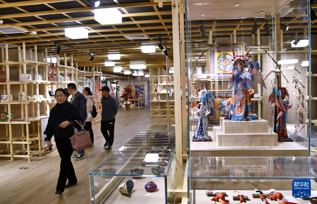 3月20日,人们在北京王府井工艺美术大厦内观看非遗文创产品展示。