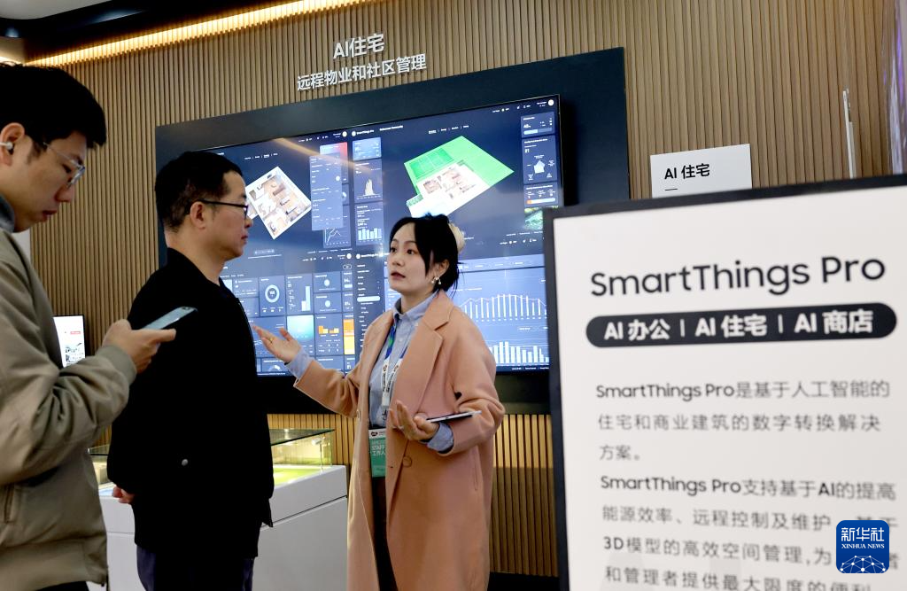 3月20日,工作人员(右)向参观者介绍AI住宅解决方案。