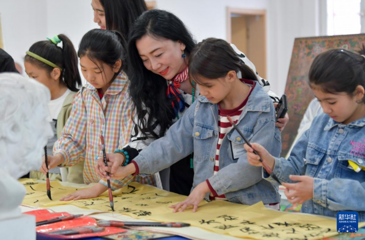 在乌鲁木齐市水磨沟区苇湖梁片区立井南社区,小朋友在公益书法课上跟随老师体验写书法(3月22日摄)。
