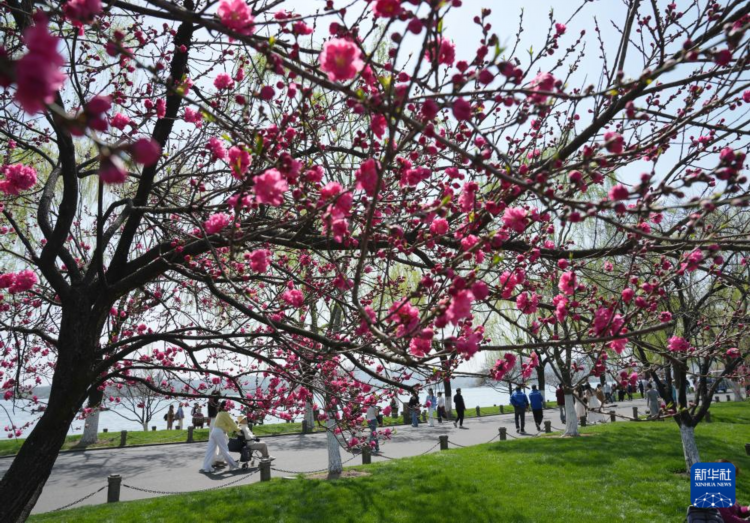 3月24日,游人走在杭州西湖白堤上。