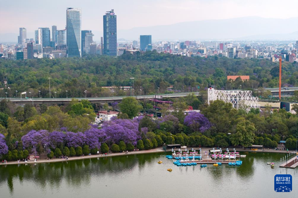 这是3月23日在墨西哥首都墨西哥城改革大道拍摄的盛开的蓝花楹(无人机照片)。 墨西哥城的蓝花楹是春天最具代表性的景观之一。每年3月至4月,这种紫蓝色花朵将城市街道、公园和广场点缀得如诗如画。 新华社记者 李木子 摄