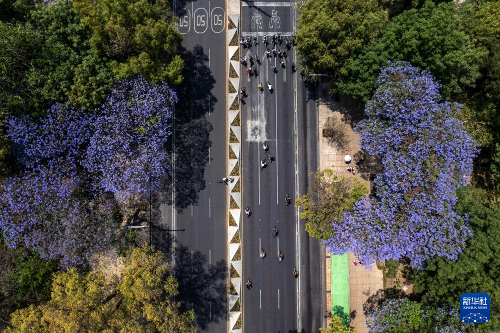 3月23日,在墨西哥首都墨西哥城,人们在改革大道盛开的蓝花楹下骑车(无人机照片)。 墨西哥城的蓝花楹是春天最具代表性的景观之一。每年3月至4月,这种紫蓝色花朵将城市街道、公园和广场点缀得如诗如画。 新华社记者 李木子 摄