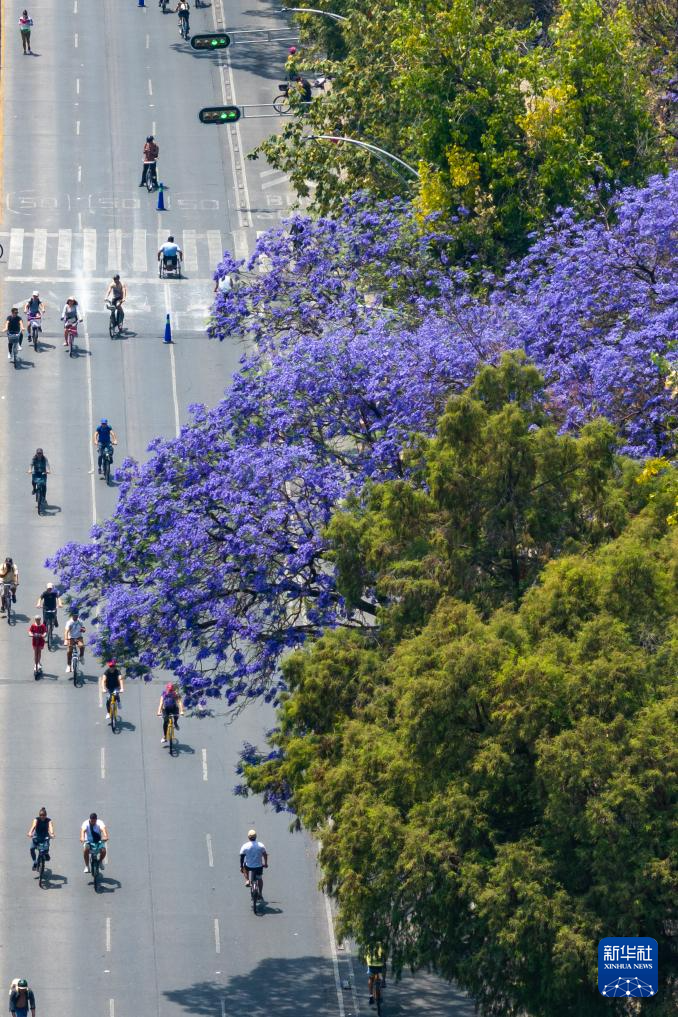 3月23日,在墨西哥首都墨西哥城,人们在改革大道盛开的蓝花楹下骑车(无人机照片)。