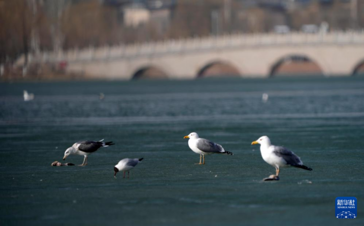 候鸟在银川市北塔湖栖息、觅食(2025年3月7日摄)。