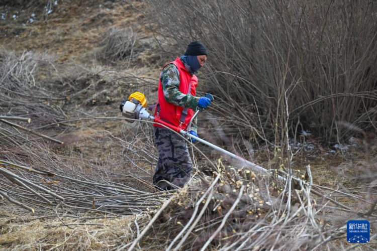 3月25日,锡林郭勒盟正镶白旗的农牧民用割灌机给红柳平茬。