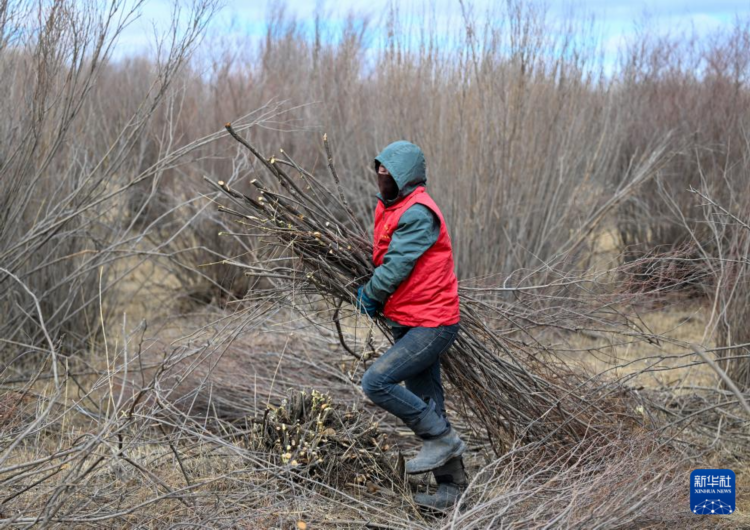 3月25日,锡林郭勒盟正镶白旗的农牧民搬运红柳条。