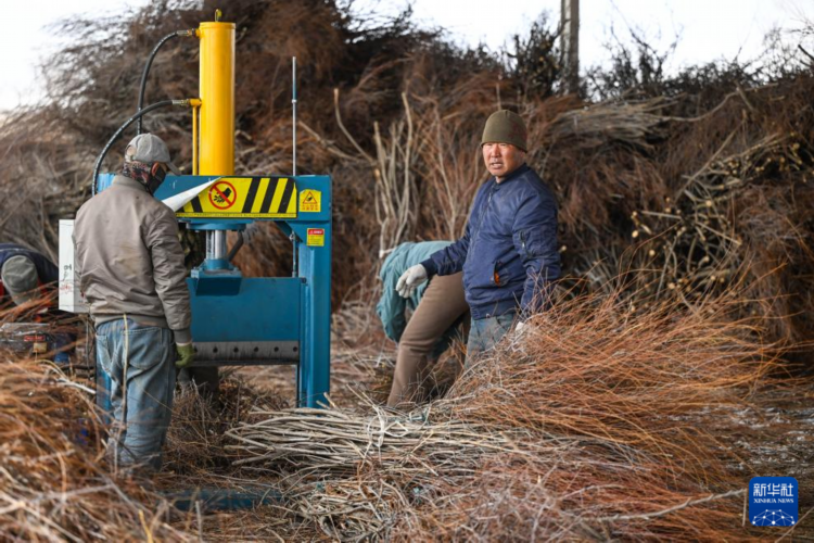 3月25日,锡林郭勒盟正镶白旗的农牧民操作机器切割红柳条。