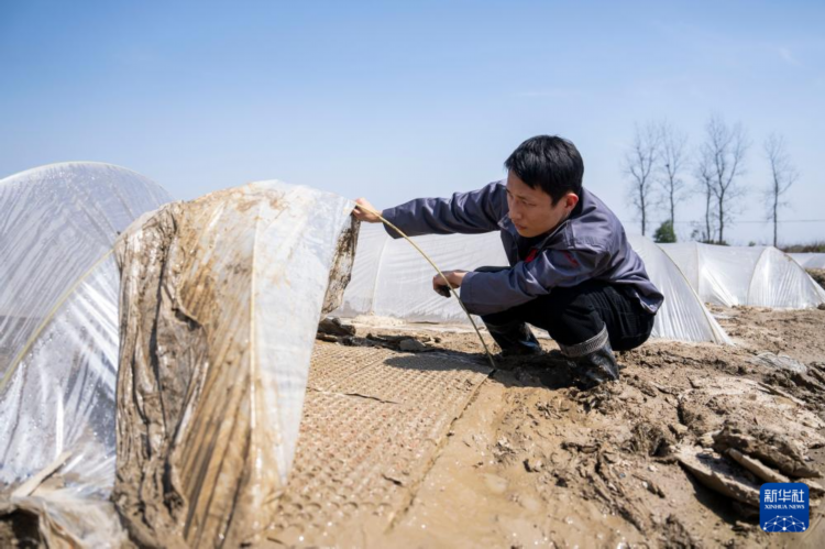 3月19日,在益阳市资阳区新桥河镇廖河村,姚帅在育秧田观察秧苗长势。