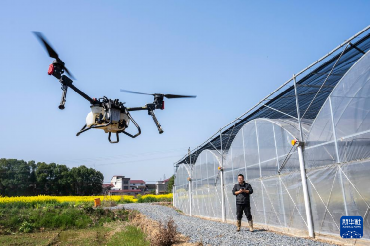 3月20日,在常德市汉寿县龙潭桥镇兴龙社区,刘含测试农用无人机。