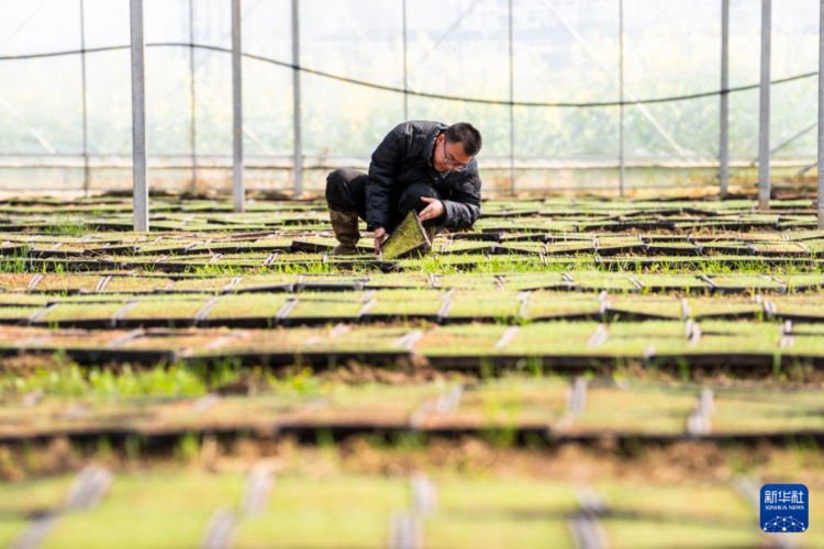 3月20日,在常德市汉寿县龙潭桥镇兴龙社区,刘含在育秧大棚观察秧苗长势。
