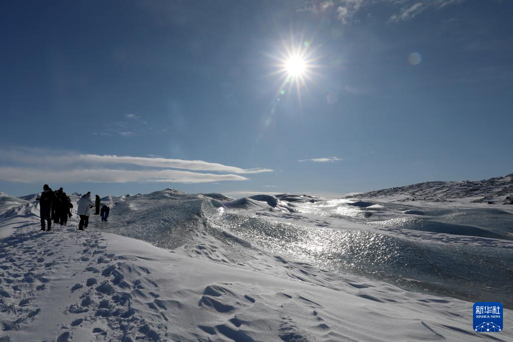走近格陵兰冰盖 3月21日,在丹麦自治领地格陵兰岛康克鲁斯瓦格附近,人们在冰盖上行走。 格陵兰冰盖是仅次于南极冰盖的世界第二大冰盖。近年来,受气候变化影响,格陵兰冰盖裂缝发展速度加快。这可能会导致格陵兰冰盖冰损失量增加,推动冰川向海洋移动,加剧海平面上升。 新华社记者 赵丁喆 摄