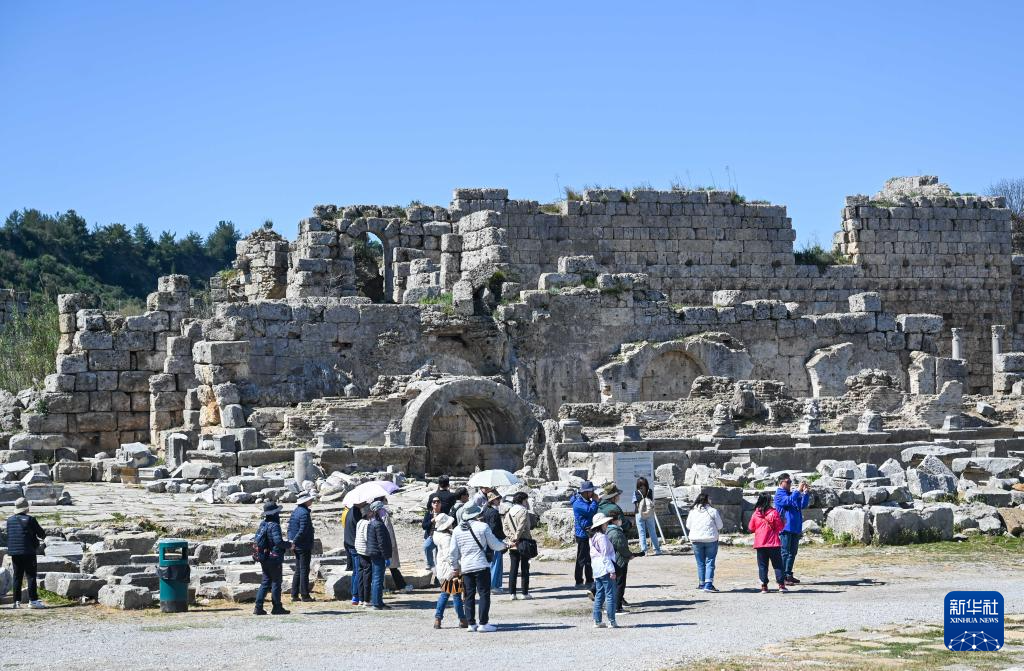 3月21日,在土耳其安塔利亚省,游客游览佩尔格古城遗址。