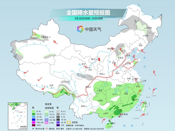 今明天,受冷暖空气交汇影响,南方降雨发展增多,部分地区还可能激发出强对流天气。其中今天,新疆南疆盆地东南部和西部山区、甘肃中北部、青海北部、内蒙古东部、东北地区中北部等地部分地区有小到中雪或雨夹雪,其中,新疆南疆盆地东南部和西部山区、内蒙古东北部、黑龙江中部等地部分地区有大雪。新疆南疆盆地西部和东南部、吉林中部、辽宁中东部、河南南部、湖北东部、江西北部、安徽大部、浙江中北部、江苏南部和西北部等地部分地区有小到中雨,其中,安徽西南部、湖北东部等地局地有大雨。