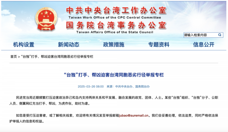 国台办:推出新举报专栏,对“台独”恶劣行径和首恶分子追责