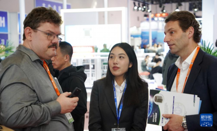 3月26日,两名外国专业观众在2025中国国际清洁能源博览会上与中方代表交流。