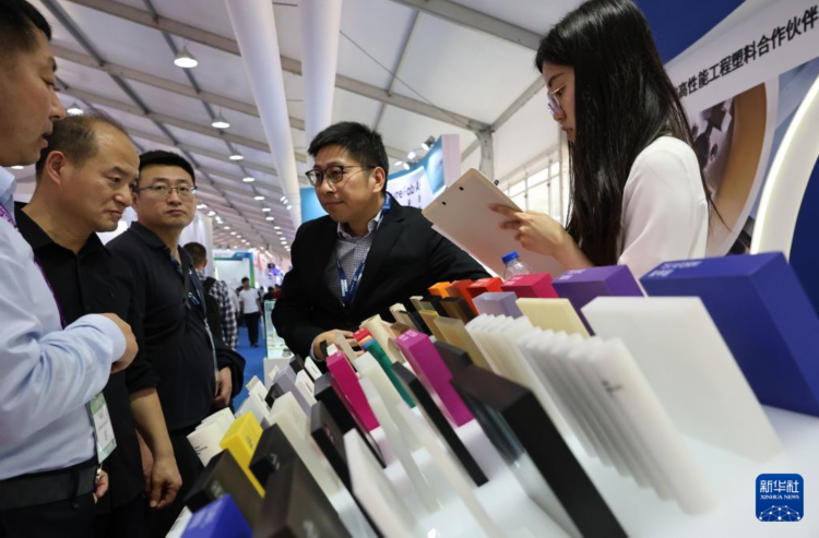 3月26日,参观者在一组高性能工程塑料展品前交流讨论。
