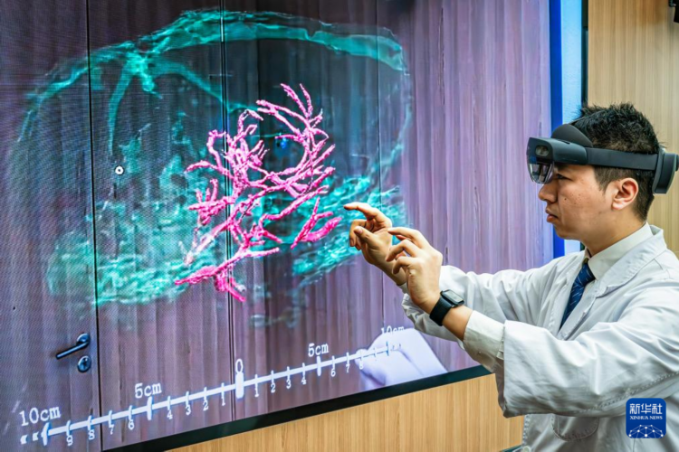 3月26日,科研人员展示通过混合现实技术,微米级呈现脑机接口装置与大鼠大脑主要血管和脑组织的空间位置关系。
