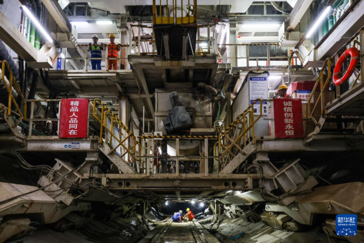 3月26日,中铁十四局施工人员在开挖直径达14.57米的“永平号”盾构机上工作。