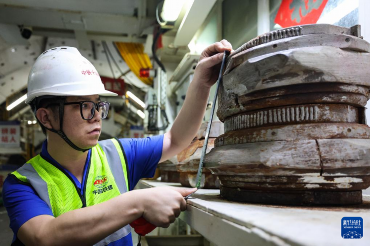 3月26日,中铁十四局施工人员测量“永平号”盾构机刀具磨损数据。