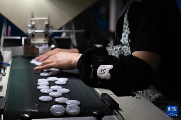 3月27日,在永嘉县桥头镇的一家钮扣生产车间,员工在对钮扣进行质检。