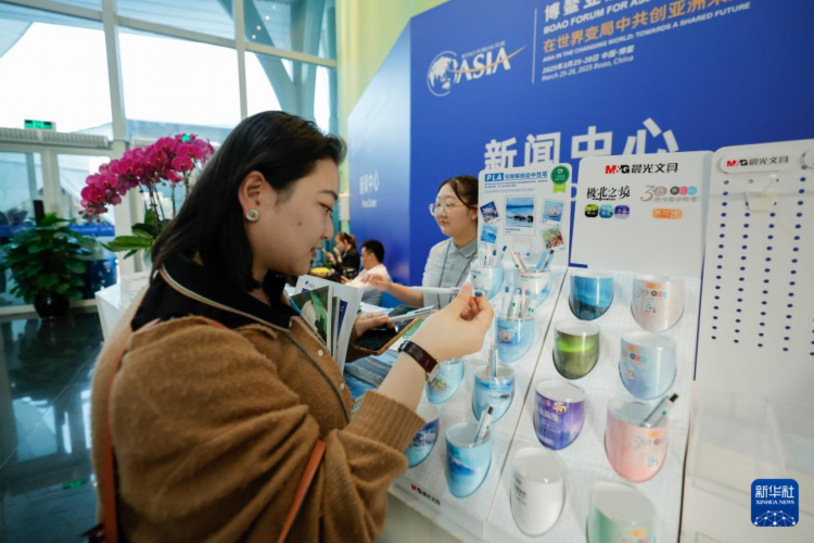 3月26日,在博鳌亚洲论坛2025年年会新闻中心,一名媒体工作者在领取可降解按动中性笔。