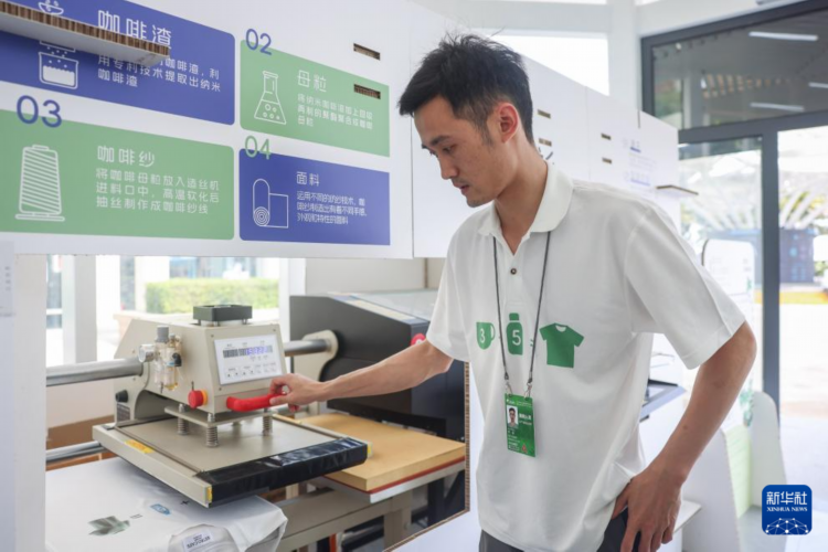 3月25日,工作人员在演示制作低碳“咖啡衫”。