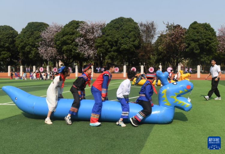 3月27日,在广西南宁市滨湖路小学,学生在开展旱地龙舟趣味赛。