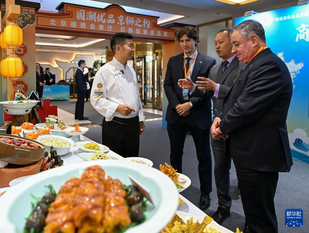3月28日,外宾在了解福建泉州石狮特色“宋元海丝宴”。 当日,来自希腊、黑山、巴拿马等25个国家的驻华使节参加在北京福建大厦举办的北京福建会客厅“世遗泉州 味连五洲”活动,他们在现场听南音、品香茗、尝美食,观看非遗表演,感受海丝文化。 石狮市位于福建泉州,是古代海上丝绸之路的重要起点。 新华社记者 陈朔 摄