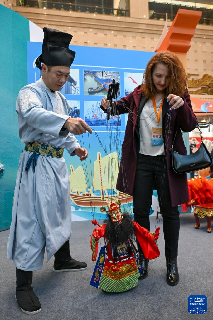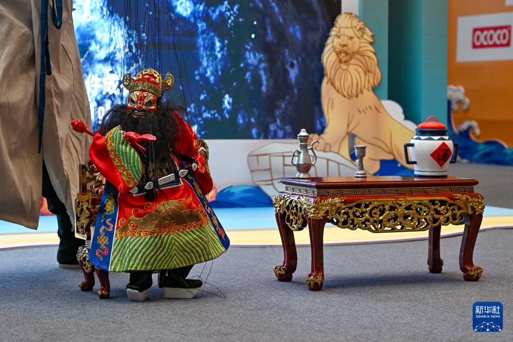 3月28日,演员在活动现场表演泉州提线木偶戏《钟馗醉酒》。 当日,来自希腊、黑山、巴拿马等25个国家的驻华使节参加在北京福建大厦举办的北京福建会客厅“世遗泉州 味连五洲”活动,他们在现场听南音、品香茗、尝美食,观看非遗表演,感受海丝文化。 石狮市位于福建泉州,是古代海上丝绸之路的重要起点。 新华社记者 陈朔 摄