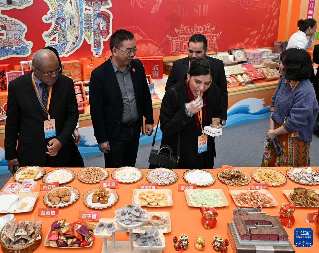 3月28日,外宾在品尝福建泉州石狮美食。 当日,来自希腊、黑山、巴拿马等25个国家的驻华使节参加在北京福建大厦举办的北京福建会客厅“世遗泉州 味连五洲”活动,他们在现场听南音、品香茗、尝美食,观看非遗表演,感受海丝文化。 石狮市位于福建泉州,是古代海上丝绸之路的重要起点。 新华社记者 陈朔 摄