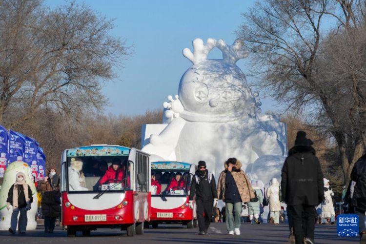 游客在哈尔滨太阳岛雪博会园区内游玩(2024年12月26日摄)。
