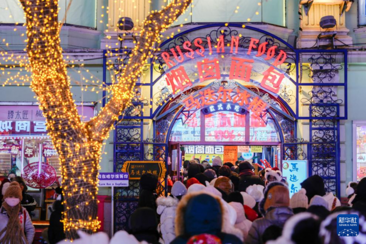 2025年1月30日,游客在哈尔滨中央大街上排队购买美食。