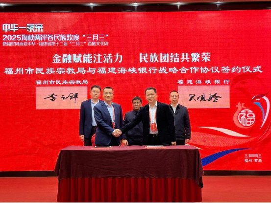 活动期间,福州市民族宗教局与福建海峡银行有限公司还签署了战略合作协议。双方将围绕金融助力台胞台企发展,推进完善金融惠民、特色产业转型升级等金融服务产品,支持两岸各族同胞共创共富,为两岸民族融合发展注入“金融活水”。