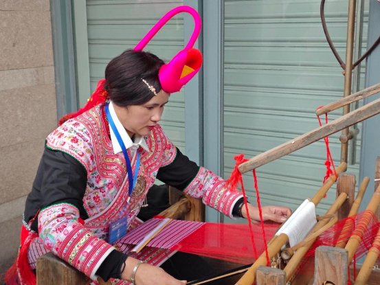 在旁的畲族刺绣和苎布织染缝纫技艺展示也十分吸引眼球。只见绣工熟练穿针引线,不多时绢布上就呈现出精美的图案。在木质的织布机前,身着民族服饰的女工熟练操作,将一根根苎麻线手工织成布料。