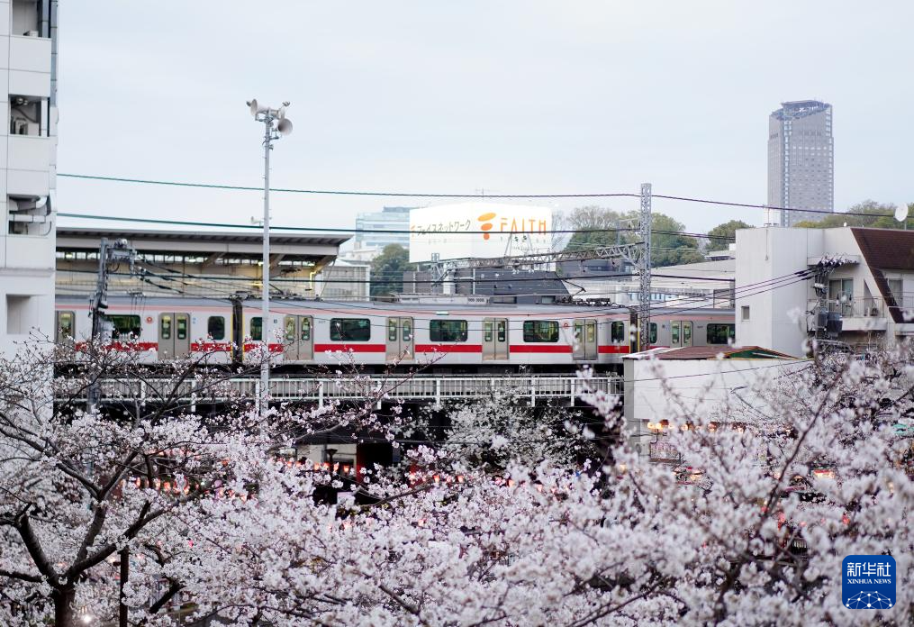 3月30日,一辆电车驶过日本首都东京目黑川畔盛开的樱花。
