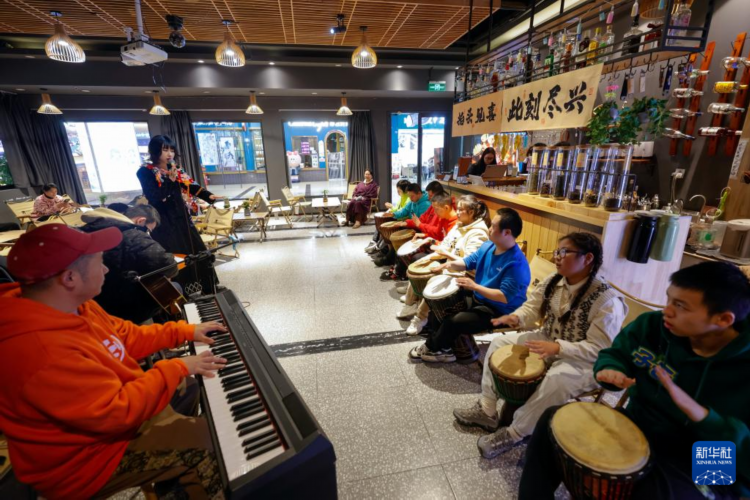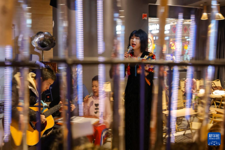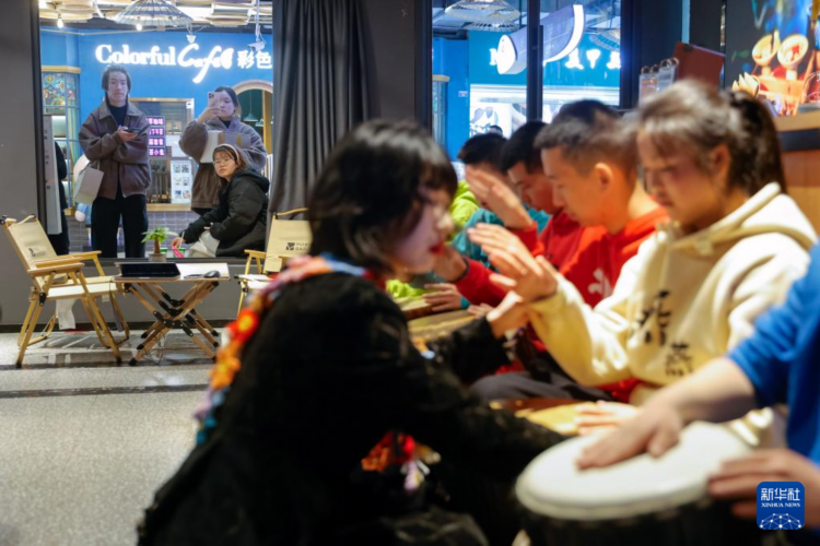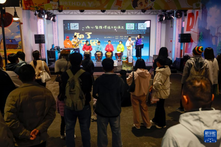 “知了小乐团”在成都市天府红购物中心演出,吸引不少观众观看(3月30日摄)。