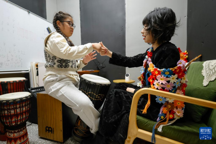 在成都市“行歌”Live House,张婉鑫(前右)指导一名“知了小乐团”的孩子练习打非洲鼓(3月30日摄)。